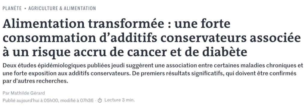 1. https://www.lemonde.fr/planete/article/2026/01/08/alimentation-transformee-une-forte-consommation-d-additifs-conservateurs-associee-a-un-risque-accru-de-cancers-et-de-diabete_6660946_3244.html