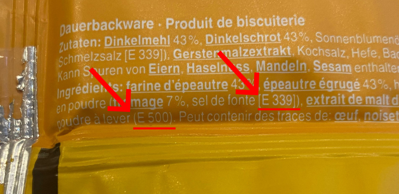 Vous n’avez qu’à prendre le premier paquet issu du commerce que vous avez sous la main, et vous trouverez des additifs dans la liste des ingrédients. En Suisse et dans tous les pays européens, ils commencent par la lettre “E” pour “Europe”.